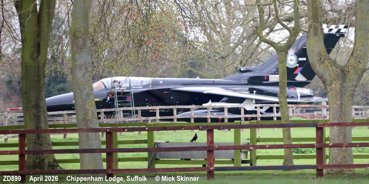 | ZD899 | Panavia Tornado F2 | AT1, 43 Sqn marks, black scheme, wears 'ZG757' | Preserved, outside | Chippenham Lodge | Apr 2026 | |