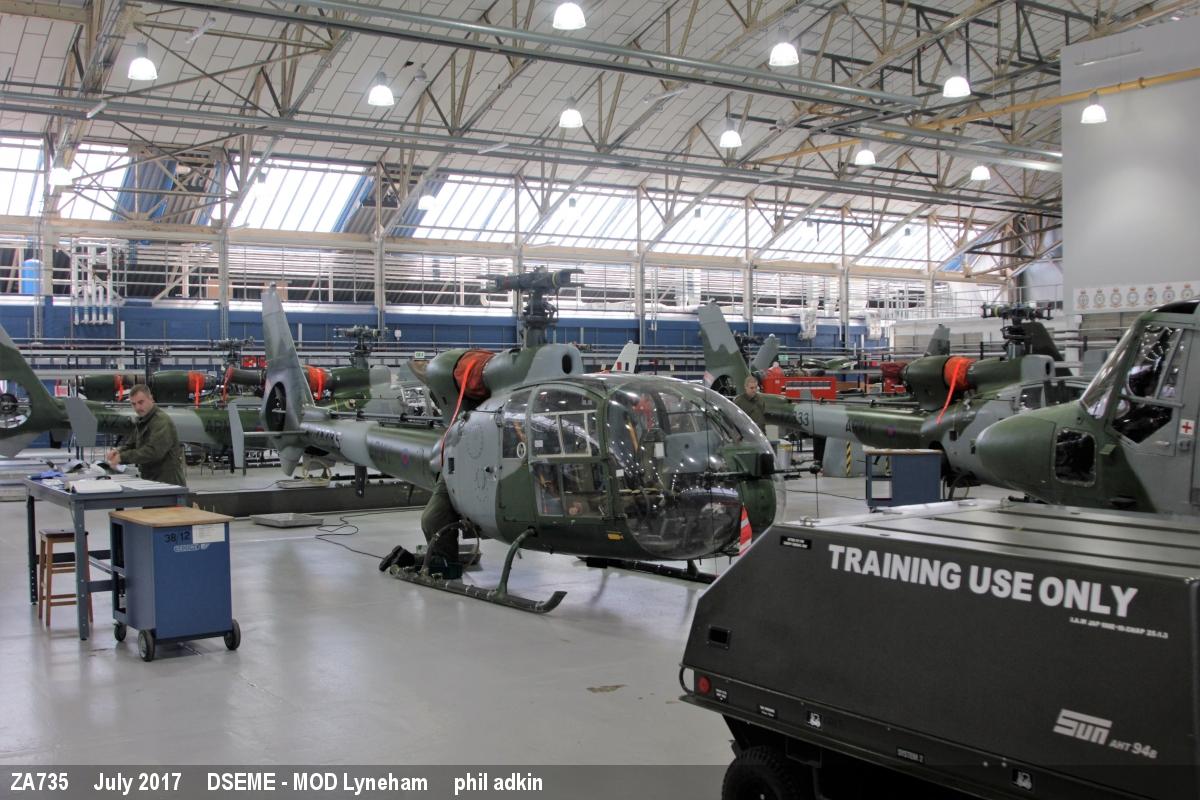 | ZA735 | Aerospatiale Gazelle AH1 | DCTT, main hangar | MoD Lyneham | Jul 2017 | ||