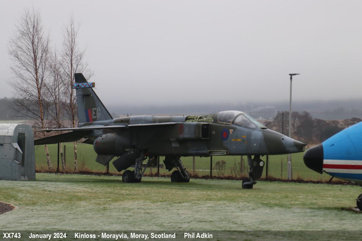 | XX743 | SEPECAT Jaguar GR1 | EG, 8949M, 6 Sqn marks | Museum, outside | Kinloss - Morayvia, Moray | Oct 2025 | |