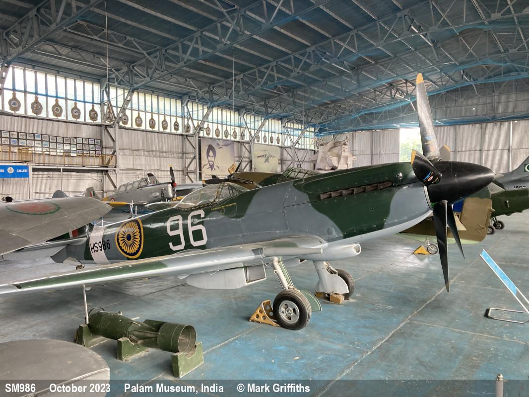 | SM986 | Supermarine Spitfire FXVIIIe | 96, HS986 | Museum, inside | Palam, India | Oct 2023 | |